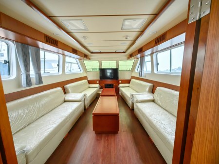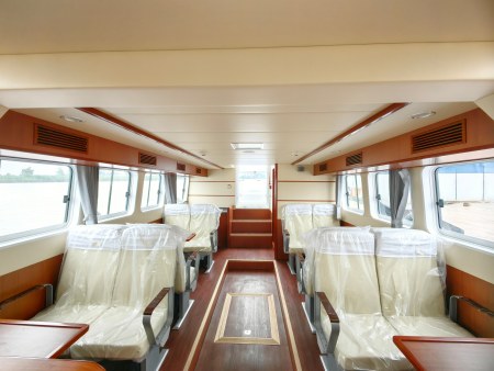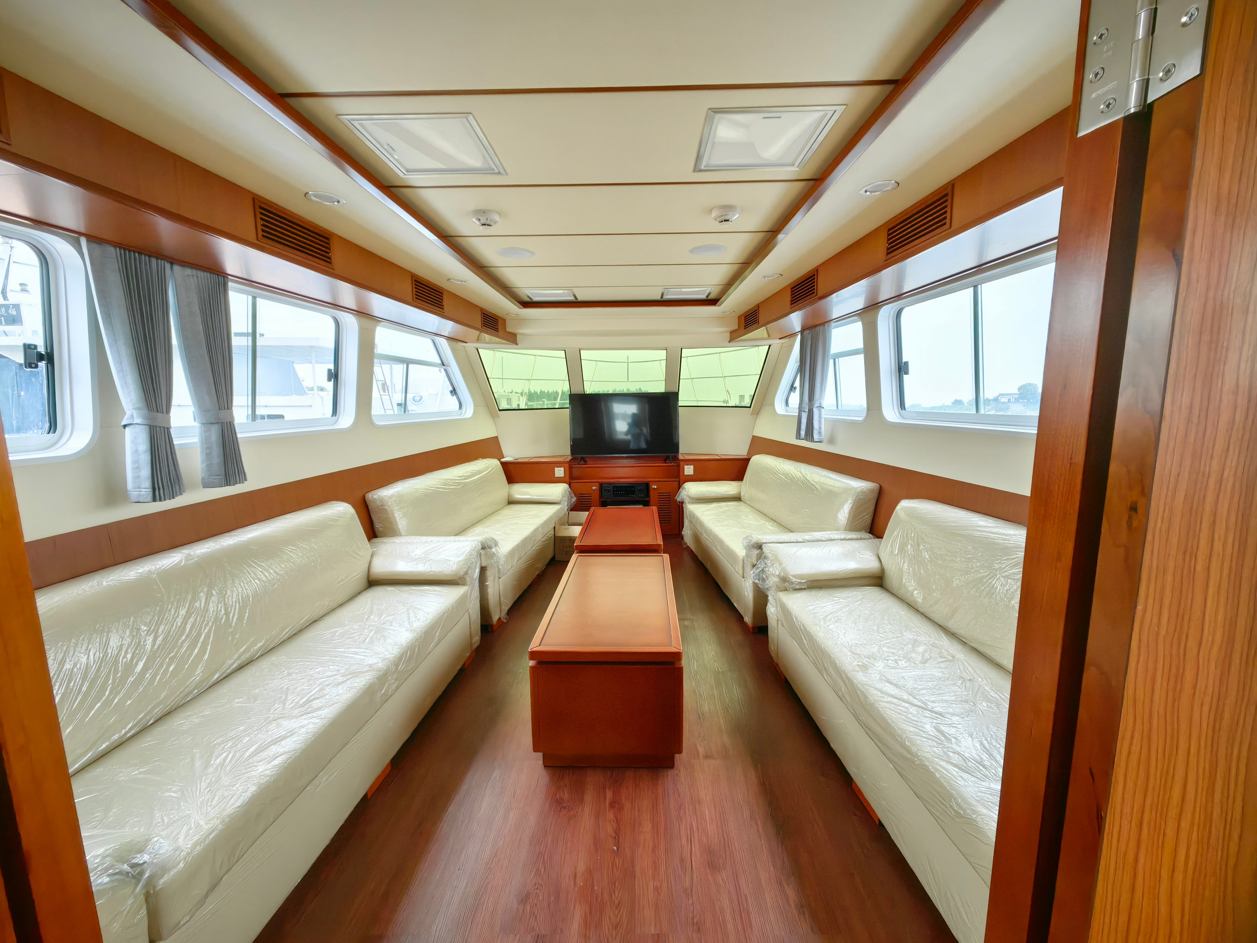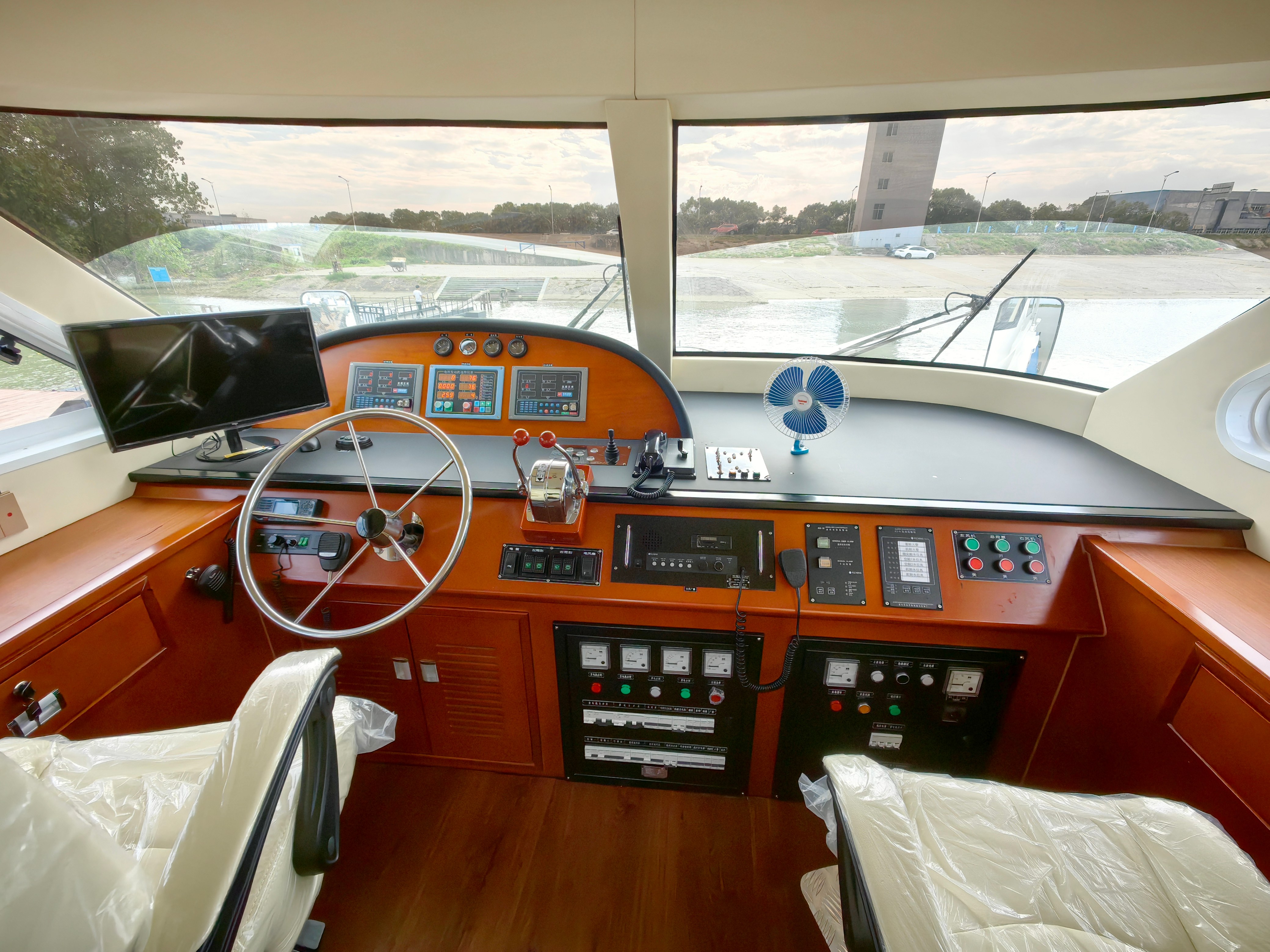 舱内装饰豪华、舒适,配有独立卫生间、船用中央空调、音响、会议室、吧台、沙发、办公桌等装备。广泛适用于巡逻执法、搜寻救援、旅游客船、水上休闲娱乐等用途。适航于我国内河B级航区。